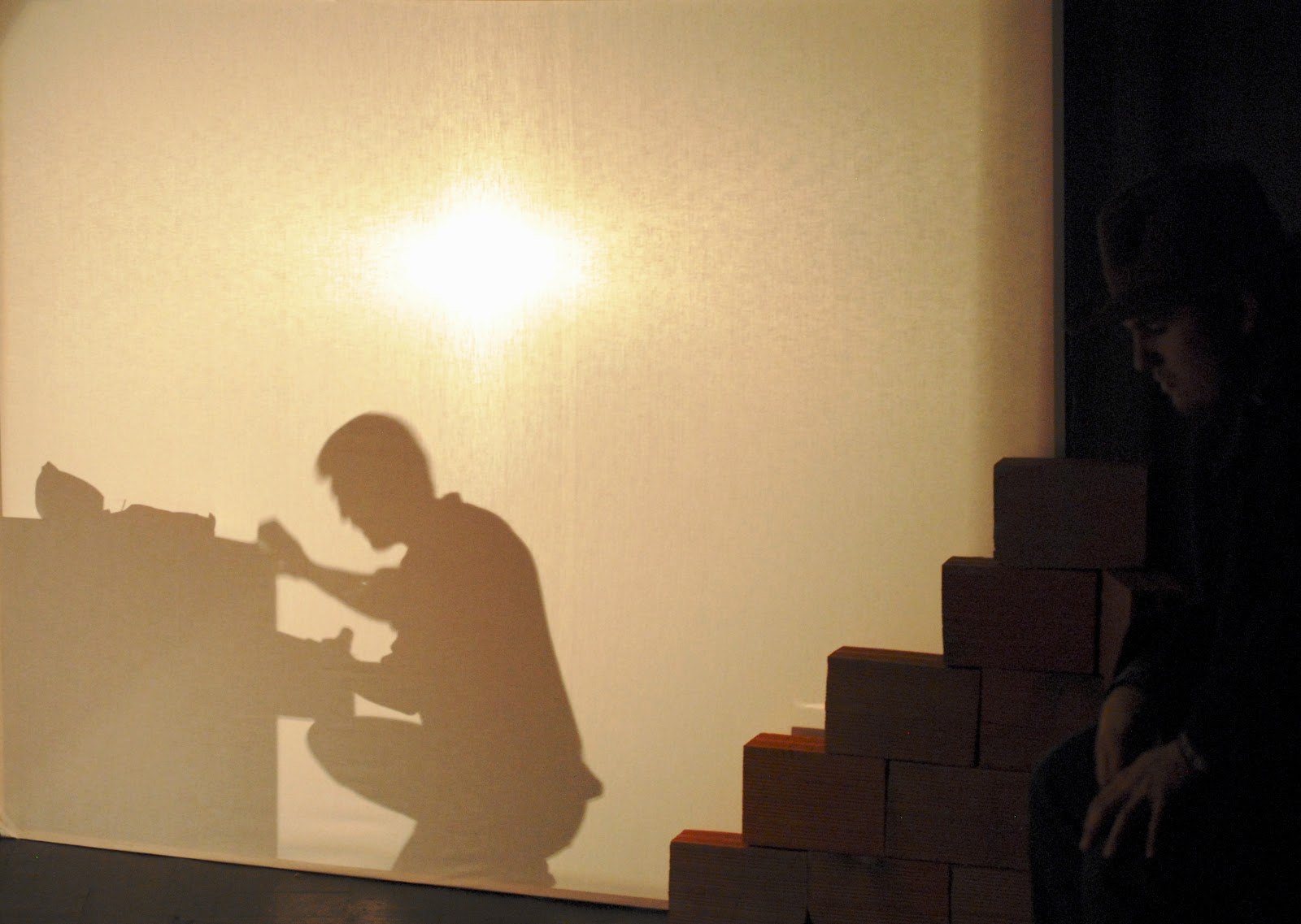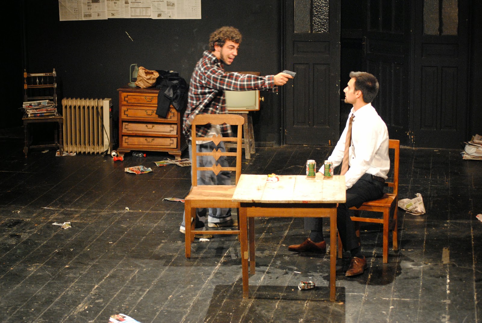 palco. Permanece sentado na penumbra com uma garrafa de whisky nas mãos, ora frio